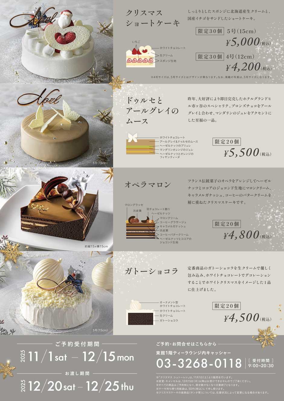 2025年は、「クリスマス シュトーレン」「クリスマス ショートケーキ」「ドゥルセとアールグレイのムース」「オペラマロン」「ガトーショコラ」の5種類です。