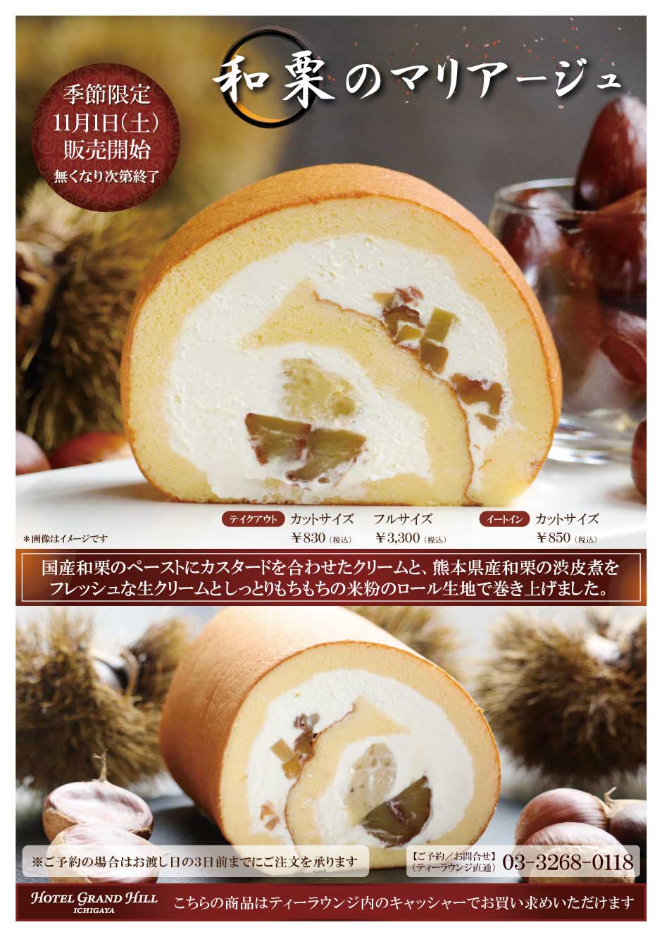 国産和栗のペーストクリームとカスタードクリームを合わせ、熊本県産和栗の渋皮煮をふんだんに使用し、 しっとりもちもちの米粉のロール生地で巻き上げました。